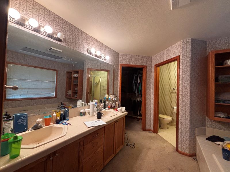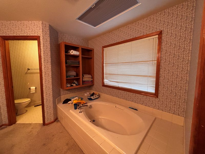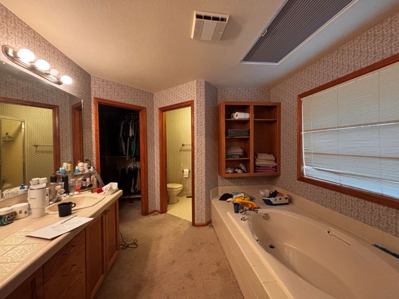 This primary bathroom underwent a complete transformation, evolving from a dated 90s layout and aesthetic into a calm, airy retreat. Originally, the space featured a cramped shower tucked into the toilet room, an oversized built-in tub, and carpeted floors resulting in a layout that felt both impractical and visually heavy. While the existing plumbing locations were maintained for efficiency, the space was thoughtfully reimagined to enhance both function and style.