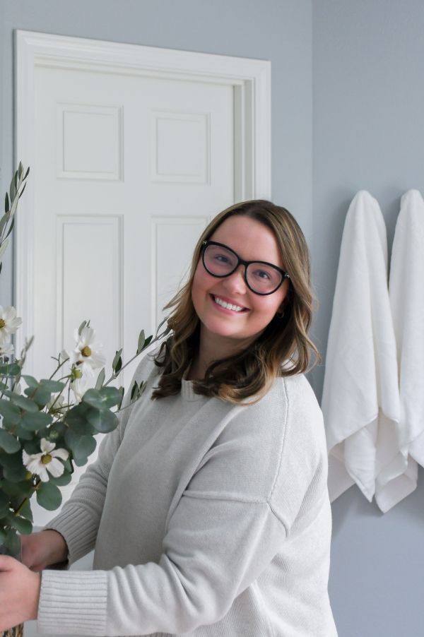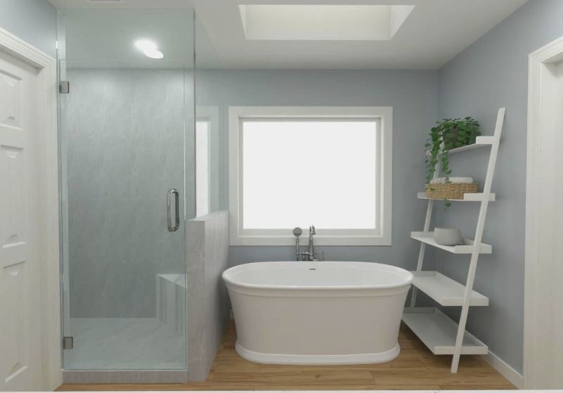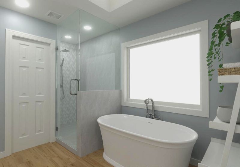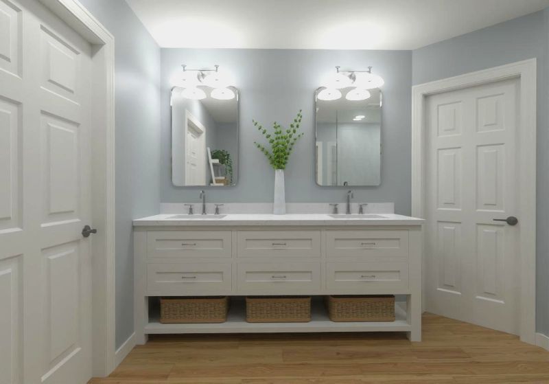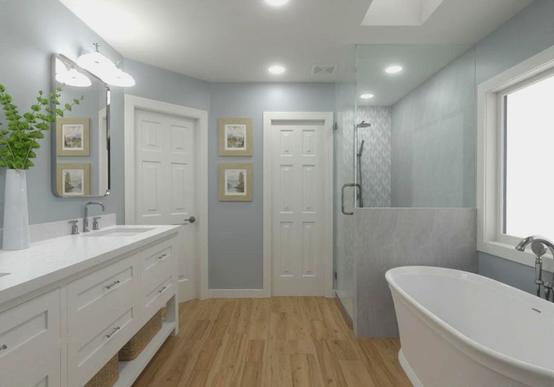 New waterproof wood luxury vinyl plank flooring introduces warmth underfoot, while fresh blue-grey paint and crisp white trim unify the space with a refined finish. A soft palette of blue-greys, whites, and chrome keeps the bathroom feeling light, cohesive, and timeless.
