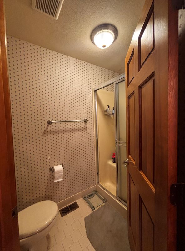 A key upgrade was the expansion of the shower into a generous 3′ x 6′ footprint. It now features large-format tile with a striking accent wall, a built-in corner bench, and a recessed niche for streamlined storage. An exposed chrome shower column adds a modern, elevated touch. The former toilet area was reconfigured into a separate water closet, improving both privacy and overall flow.
