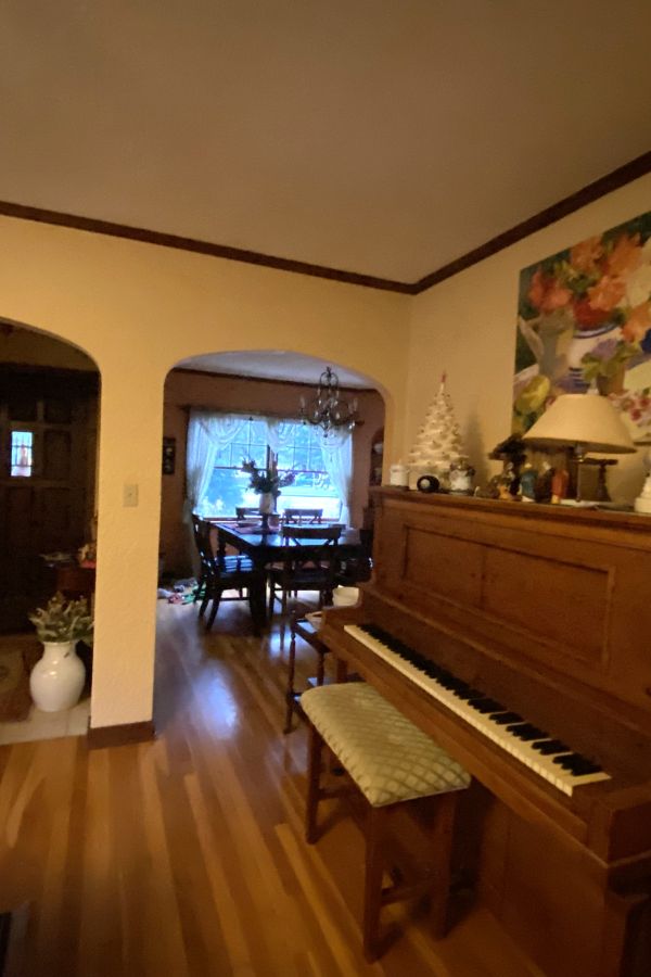 The room is color-drenched in a rich forest green, creating a moody, enveloping atmosphere, while leather club chairs and a family heirloom desk furnish the space with elegance and character. The original servery door, connecting the former dining room to the home’s office, was retained, maintaining a link to the home’s history and layout.