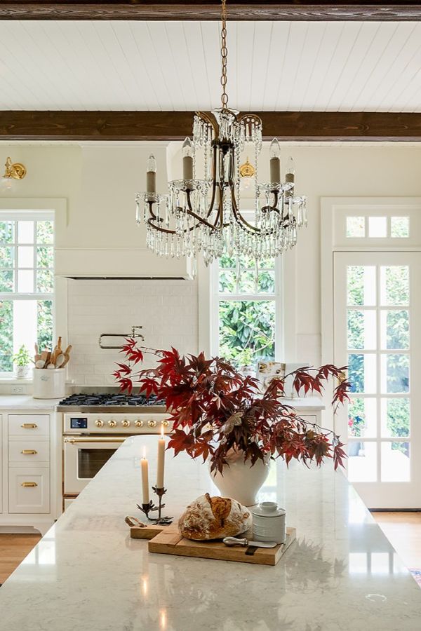 The breakfast nook itself is pure cottage charm, with built-in bench seating, a replicated arched niche for display, and a view that invites cozy mornings and quiet evenings. An antique crystal chandelier hangs above the island, each crystal catching and giving a special sparkle, while a leaded diamond-glass transom gracefully frames the entry to the butler’s pantry.