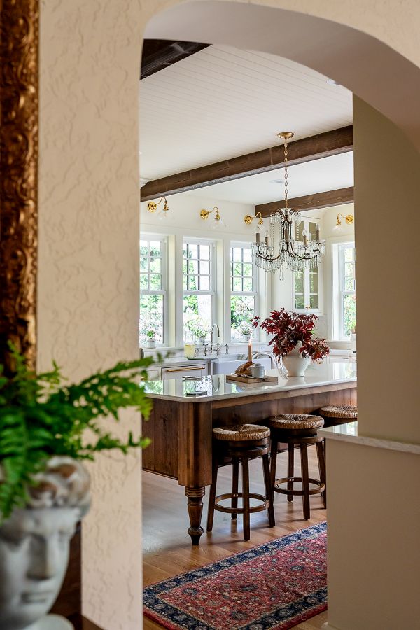 To give the space a sense of grandeur, the ceiling was raised a foot higher than the rest of the home. Tongue-and-groove paneling and hand-hewn beams lend a feeling of intention and history to the added height. Arched openings—echoing the home’s original architecture—frame the breakfast nook, dining room, and entry to the living room.